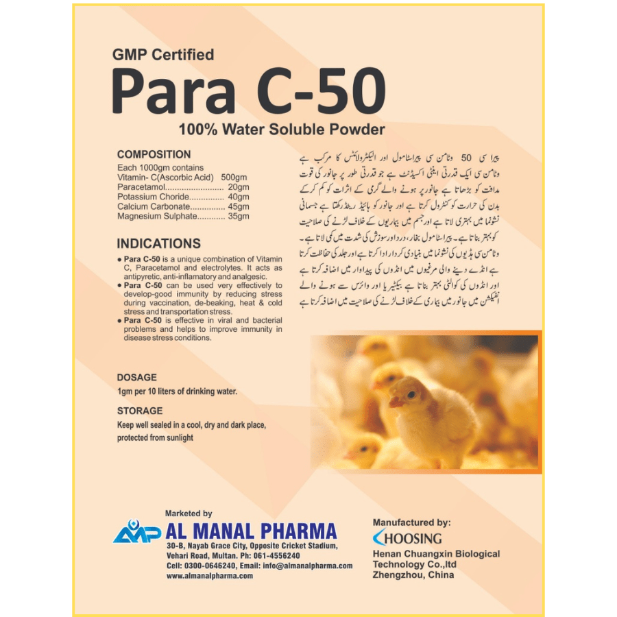 پیرا سی 50 وٹامن سی پیراسٹامول اور الیکٹرولائٹس کا مرکب ہے وٹامن سی ایک قدرتی اینٹی اکسیڈنٹ ہے جو قدرتی طور پر جانور کی قوت مدافت کو بڑھاتا ہے جانور پر ہونے والے گرمی کے اثرات کو کم کر کے بدن کی حرارت کو کنٹرول کرتا ہے اور جانور کو ہائیڈ ریٹڈ رکھتا ہے جسمانی نشونما میں بہتری لاتا ہے اور جسم میں بیماریوں کے خلاف لڑنے کی صلاحیت کو بہتر بناتا ہے ۔ پیراسٹامول بخار ، درد اور سوزش کی شدت میں کمی لاتا ہے ۔ وٹامن سی ہڈیوں کی نشونما میں بنیادی کردار ادا کرتا ہے اور جلد کی حفاظت کرتا ہے انڈے دینے والی مرغیوں میں انڈوں کی پیداوار میں اضافہ کرتا ہے اور انڈوں کی کوالٹی بہتر بناتا ہے بیکٹیریا اور وائرس سے ہونے والے انفیکشن میں جانور میں بیماری کے خلاف لڑنے کی صلاحیت میں اضافہ کرتا ہے